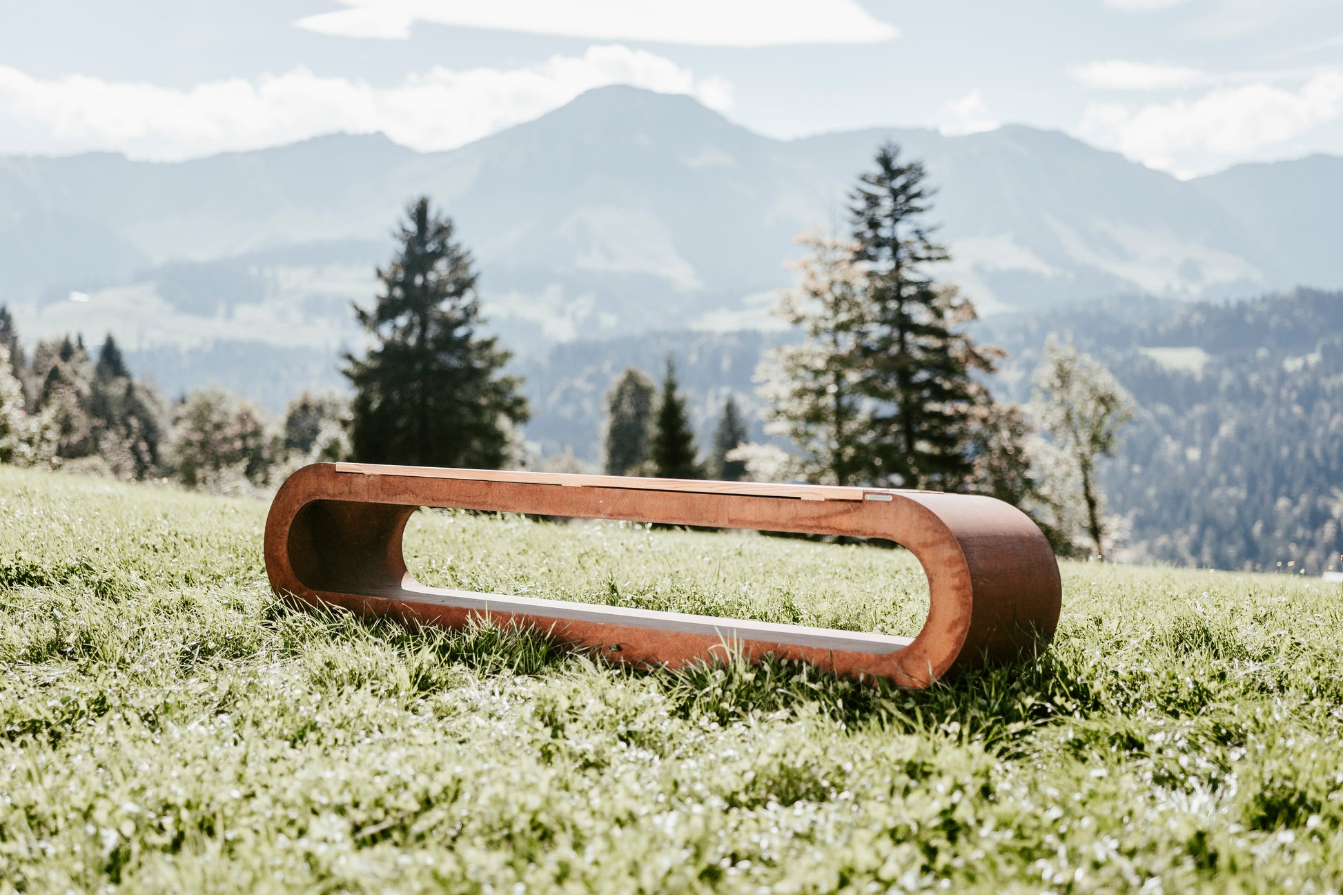 Der umlaufende Rahmen aus hochwertigem Stahl entwickelt im Laufe der Zeit eine charakteristische Rostpatina, die nicht nur ästhetisch überzeugt, sondern das Material zugleich dauerhaft vor Witterungseinflüssen schützt. Die integrierte Sitzauflage aus massivem Holz sorgt für angenehmen Sitzkomfort und setzt einen warmen, natürlichen Kontrast zur industriellen Optik des Stahls.