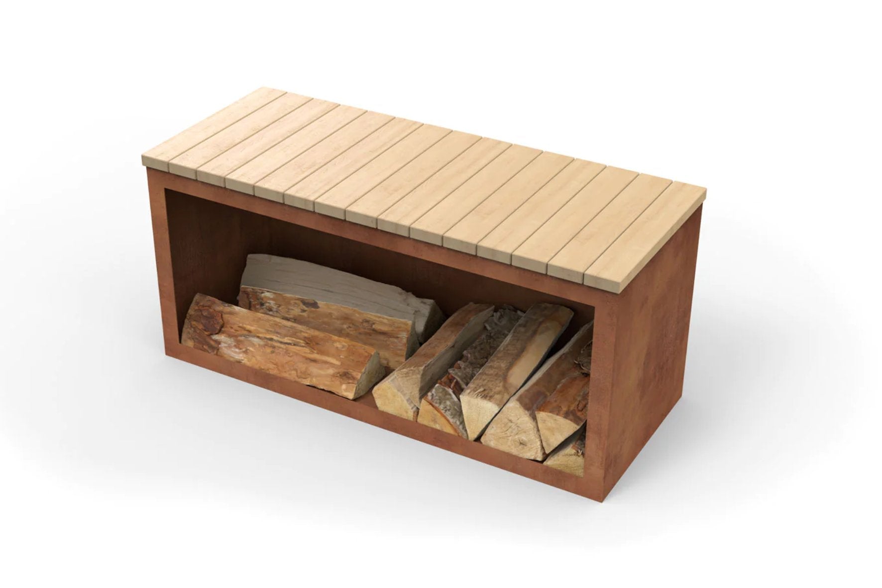- Die bequeme Sitzbank bietet offenen Stauraum für Feuerholz und anderes
